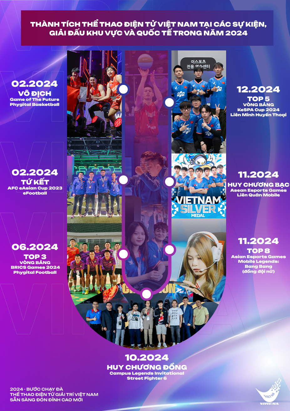 Đến cuối năm 2024, Việt Nam chứng kiến những thành tựu nổi bật của thể thao điện tử Việt Nam. Đội tuyển All Stars Việt Nam đã có màn trình diễn ấn tượng khi giành chiến thắng trước đội tuyển T1 trong vòng bảng giải đấu KePSA Cup 2024, khẳng định sự tiến bộ và khả năng cạnh tranh của Việt Nam trong khu vực. Đặc biệt, đội tuyển quốc gia Liên Quân Mobile Việt Nam đã giành huy chương bạc tại Đại hội Thể thao điện tử châu Á - 2024 Asian Esports Games, khép lại một giai đoạn chuyển mình để tiến tới những giấc mơ “vàng” về tương lai của thể thao điện tử nước nhà.